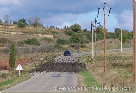On the way back from Magalas we saw a remarkable sight – a huge flock of very small birds settled on the (not very busy) road. We watched them for about five minutes while I took a lot of photos. Each time a car came close they flew up into the sky and circled around the vineyards for just a few seconds before settling on the road again. There must have been hundreds, if not thousands, of them. There didn’t seem to be anything for them to feed on, so it’s a mystery why they were on the road. It seems a bit late in the year for birds to be gathering to migrate, but it’s possible they are migrating birds from further north either arriving here for the winter or just passing through. My researches on the internet and in bird books suggest they may have been Wood Larks. I’d welcome any other suggestions. They were much too small to be starlings.